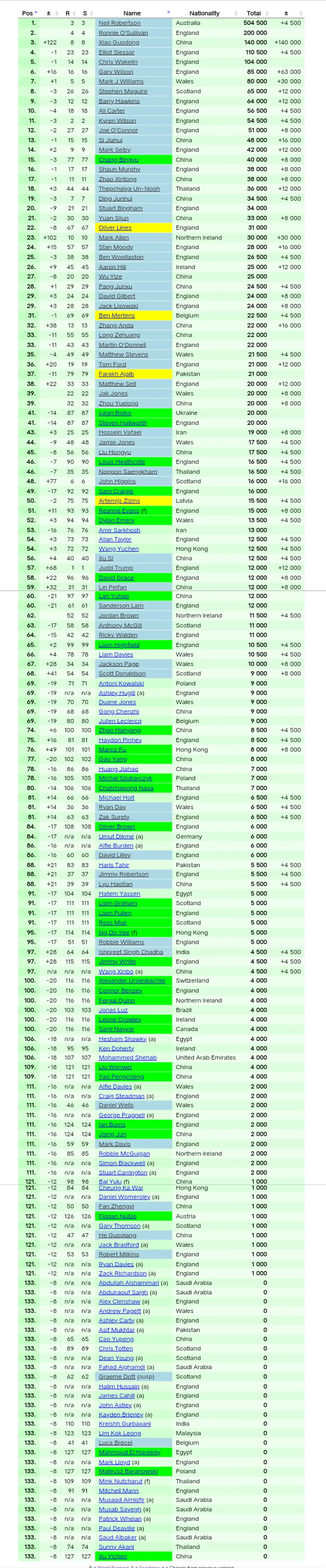 斯诺克最新赛季排名: